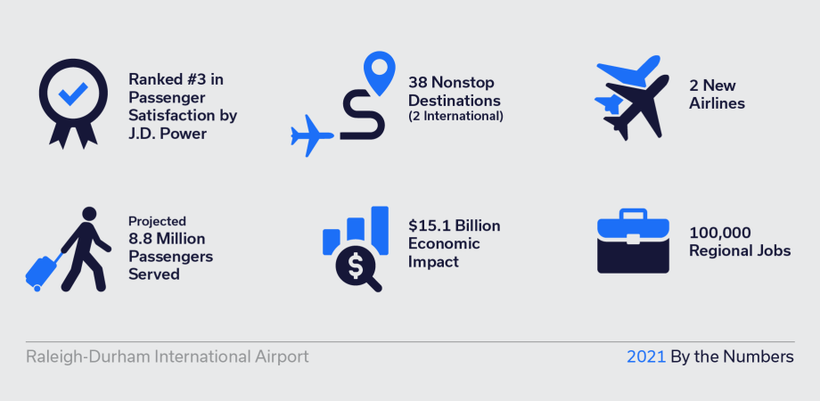 The COVID-19 pandemic disrupted years of record growth at RDU, but the airport rang in 2021 with a new sense of optimism as it prepared for a prolonged but steady recovery. Passenger traffic increased at a robust pace, allowing RDU to direct its efforts toward recovering from the COVID-19 pandemic, welcoming back travelers, recovering nonstop destinations and building for the future.